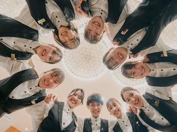 どの職種もほとんどのスタッフが未経験からのスタートです。基本の業務マニュアル、定期的な店舗内研修があり、日々の業務も先輩スタッフがしっかりサポートします。接客マナーの習得はもちろん、コミュニケーションスキルの向上が期待できます。同世代はもちろん、幅広い世代との接点をフォーマルな場で持てるのはブライダル業界で働くからこそ得ることのできる経験。緊張もするけれど、「完全貸切」の当社だからこそ提供できる安心の環境でチームワーク抜群の仲間と一緒に、楽しみながら成長しましょう!