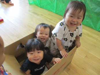 保育士がダンボールにかくれて、いない・いない・ばあー!
