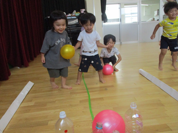 夏まつりごっこでボーリングを楽しんでいます!ストライク⁉