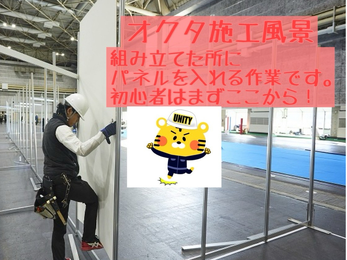 A...イベント会場(展示会場・ライブやフェス会場等)のテント・備品・控室などの空間を自分たちで作るお仕事!