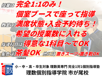 理数個別指導学院 市が尾校 【理数個別指導学院 市が尾校 】完全1対1での個別指導!週1日〜OK、英語・算数・数学・理科の中から得意な1科目でOK!