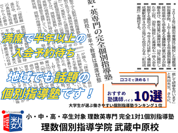 理数個別指導学院 武蔵中原校 【理数個別指導学院 武蔵中原校】完全1対1での個別指導!週1日〜OK、英語・算数・数学・理科の中から得意な1科目でOK!