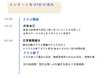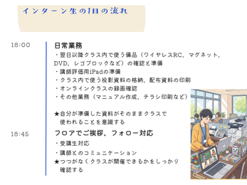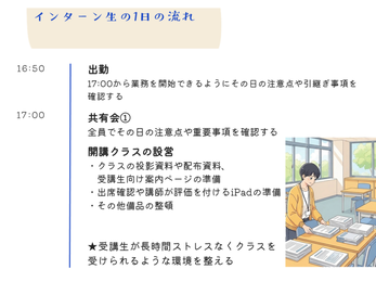 →まずは簡単な教室準備や資料印刷から、先輩に教えてもらいながらステップアップしていきましょう^^
